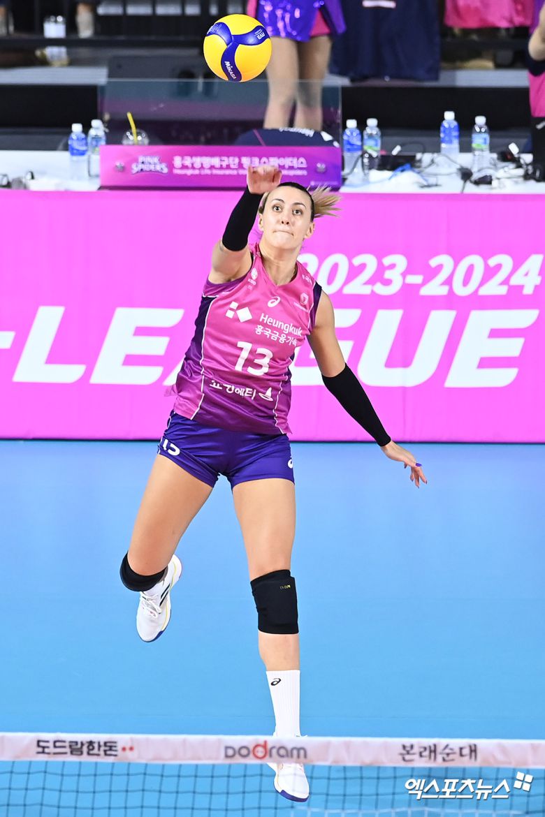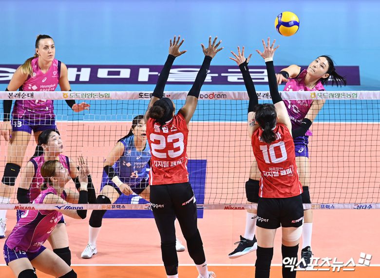 여자프로배구 흥국생명은 22일 인천 삼산월드체육관에서 열린 도드람 2023~2024 V-리그 1라운드 페퍼저축은행과의 홈경기에서 세트스코어 3-0(25-19 26-24 29-27)으로 완승을 거뒀다. 2, 3세트 후반 역전극을 펼치며 짜릿한 승리를 손에 넣었다.
