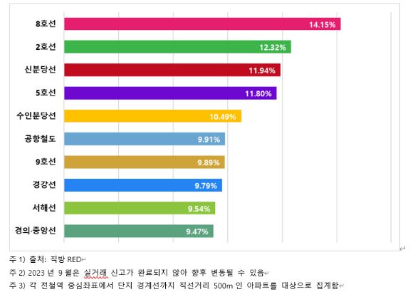 수도권 지하철 노선별 역세권 아파트 매매가격지수 상승률. [사진=직방] |