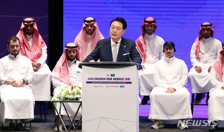 [리야드=뉴시스] 전신 기자 = 사우디아라비아를 국빈 방문 중인 윤석열 대통령이 23일(현지시간) 리야드 킹 사우드 대학교에서 열린 사우디아라비아 미래 세대와의 대화에서 '청년, 미래를 이끄는 혁신의 주인공'을 주제로 강연하고 있다. 2023.10.23. photo1006@newsis.com