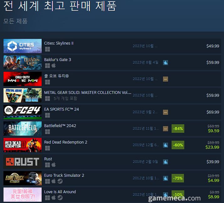 그 외에는 60% 할인을 시작한 레드 데드 리뎀션 2가 7위를 차지했으며, 지난 18일 출시되어 ‘매우 긍정적’ 평가를 받는 실사 비주얼 노벨 신작 러브 이즈 올 어라운드가 10위에 올랐다.