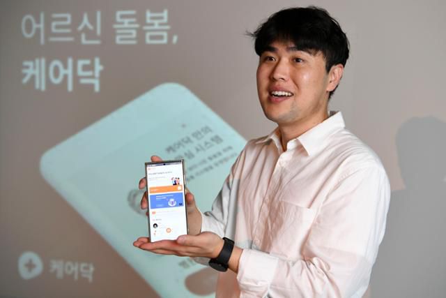 박재병 케어닥 대표가 서울 세종대로 한국일보사에서 노인돌봄 앱을 보여주며 에이지테크 사업에 대해 설명하고 있다. 그는 요양등급 없는 노인들에게도 돌봄 서비스를 제공하며 노인들을 위한 주거공간 임대사업도 하고 있다. 윤서영 인턴기자