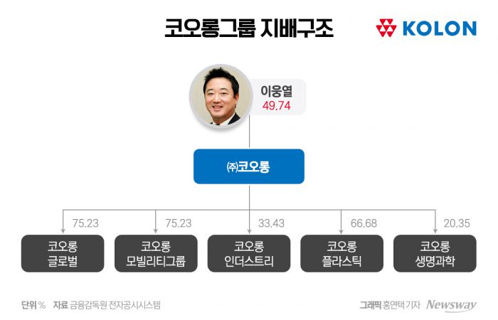 이웅열 명예회장이 지배하는 지주회사 ㈜코오롱은 코오롱모빌리티그룹(75.23%), 코오롱글로벌(75.23%), 코오롱인더스트리(33.43%), 코오롱플라스틱(66.68%), 코오롱생명과학(20.35%) 등 5개의 상장사와 코오롱인베스트먼트 등 40개의 비상장사를 거느리고 있다.