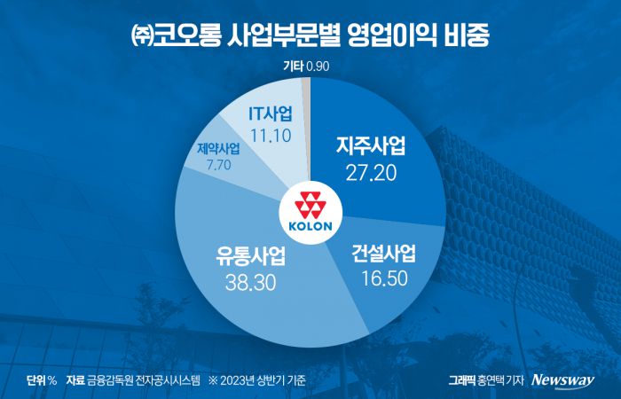 코오롱그룹의 주요 사업은 크게 핵심 소재, 패션, 건설‧유통‧레저, 환경‧에너지, 자동차부품‧IT‧복합재, 바이오‧헬스케어 등으로 나뉜다. 수입차 판매 등 유통 사업의 비중이 가장 높고, 이어 건설사업, IT사업, 제약사업 등이 뒤를 잇고 있다.