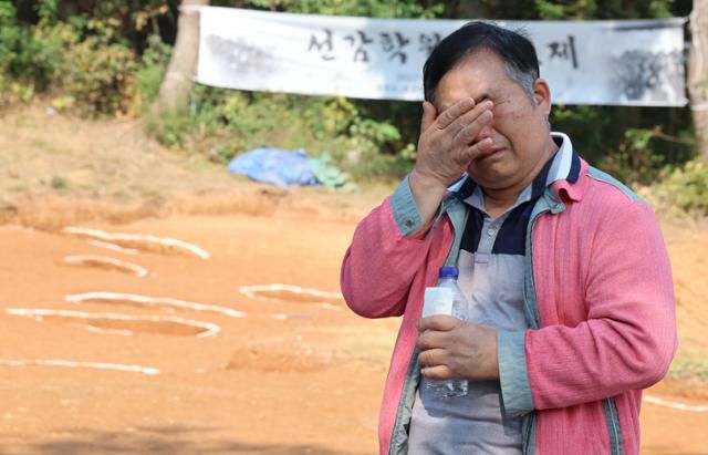 25일 경기도 안산시 단원구 선감도에서 열린 진실화해위원회를위한과거사정리위원회 주최 '선감학원 아동 인권침해 사건 유해발굴 현장 언론공개 설명회'에서 희생자의 친구가 눈물을 흘리고 있다. 뉴스1