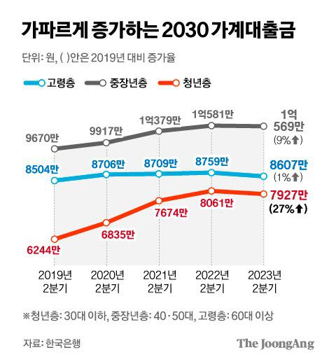영끌·빚투의 주축은 2030 청년층이다. 올해 2분기 30대 이하의 1인당 가계대출금은 약 7900만원으로 2019년 2분기(6200만원)보다 27% 늘었다. 같은 기간 중장년층(40~50대)이 9%(900만원), 60대 이상 고령층이 1%(100만원) 증가한 것과 비교하면 증가 폭이 압도적으로 크다. 청년층 가계대출 중 주택 관련 대출금은 약 70%(5504만원)를 차지했다. 4년 전엔 이 비율이 62%였다. 자금조달계획서 기준 연령별 주택 매입 비중도 청년층이 33.1%로 가장 높았다.