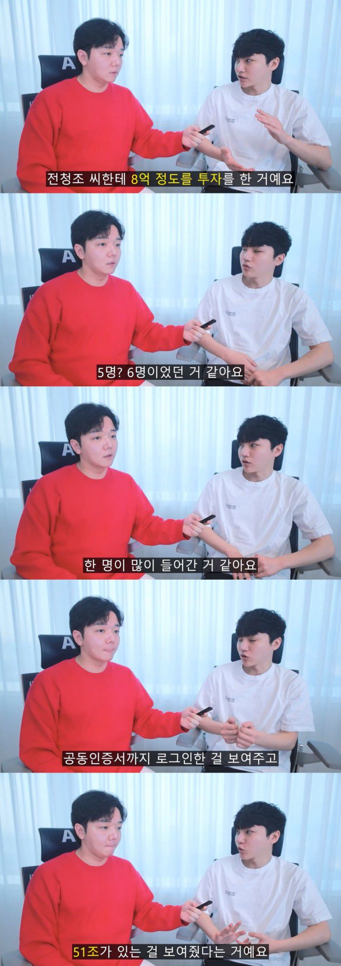 수강생 입장에서는 자신의 눈앞에서 51조 있는 자산가가 투자를 제안하면서 적은 돈으로 큰돈을 벌 수 있다고 말하면 혹할 수밖에 없었을 것. 수강생의 피해 금액은 1천만 원에 해당하지만, 그의 지인들 4~5명이 모여 총 8억 원의 피해를 입었다고 한다.
