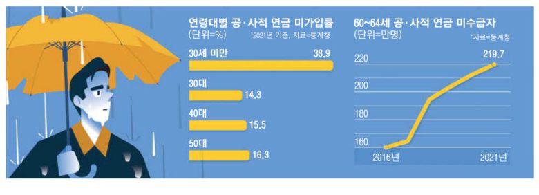 단시간 근로를 선호하고 취업 시기도 늦어지면서 공·사적 연금을 전혀 준비하지 못한 청년층이 290만명에 달하는 것으로 나타났다. 은퇴 후 재취업을 못 한 상태에서 연금도 한 푼 받지 못하는 60~64세 고령층도 114만명에 달했다. 청년층과 고령층 모두 현재 공·사적 연금에 대한 불만이 쌓이면서 노후 소득을 보장하기 위해 국민연금을 포함한 연금 제도 개편에 대한 목소리가 커지고 있다.