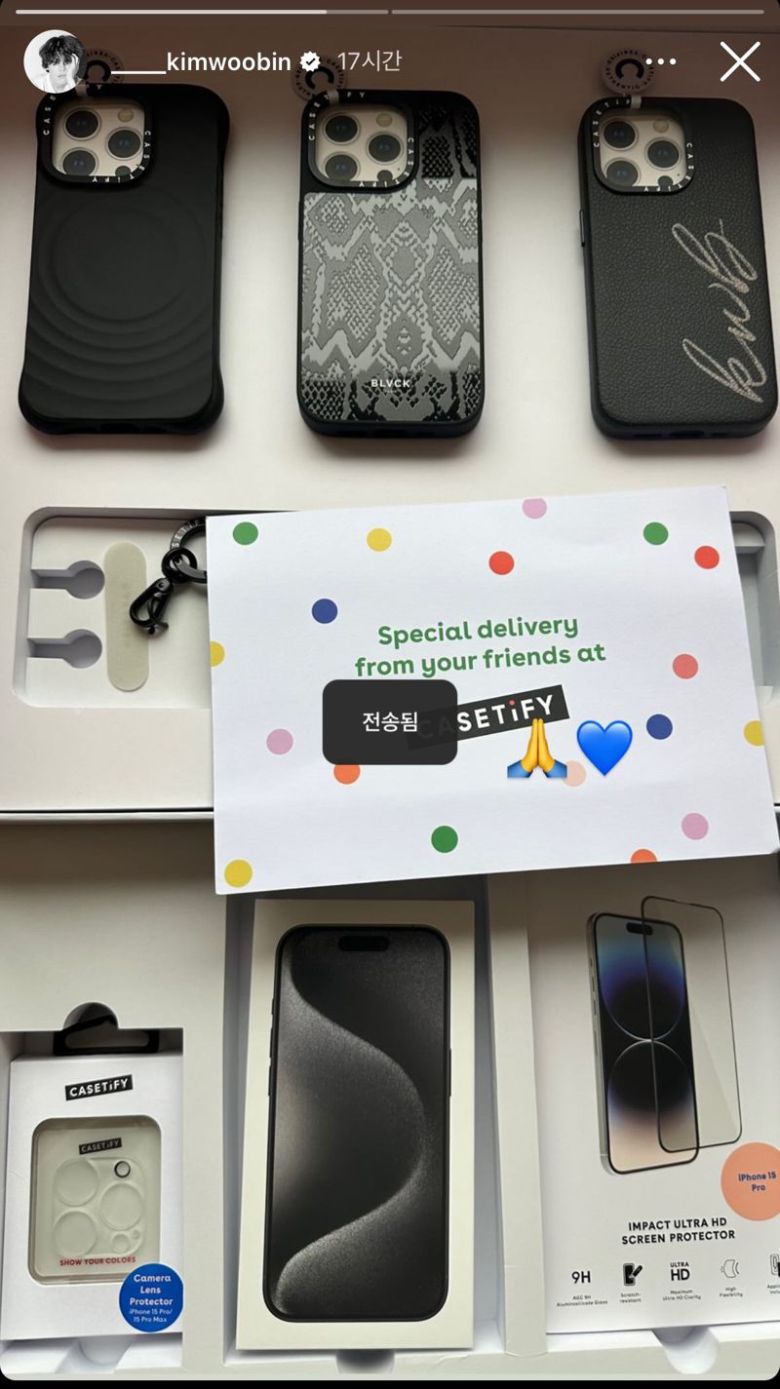 27일 관련 업계에 따르면 김우빈은 최근 테크 액세서리 브랜드 케이스티파이로부터 선물을 받은 것으로 보이는 아이폰15프로 라인업과 아이폰 케이스 3종, 액정보호필름 등이 한 데 있는 사진을 인스타그램 라이브에 올렸다.