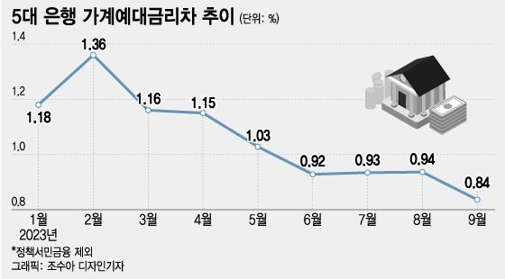 27일 은행연합회에 따르면 5대 은행(KB국민, 신한, 하나, 우리, NH농협은행)의 신규 취급액 기준 9월 가계예대금리차(가계대출금리-저축성수신금리)는 단순 평균 0.836%포인트(p)로 집계됐다. 이는 정책서민금융 상품을 제외한 수치로 한 달 전(0.936%)보다 0.1%p 하락하며 세 달만에 축소 전환했다.