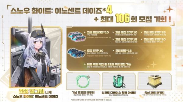 이 회사는 접속 및 스토리 이벤트, 미니게임 등의 보상으로 고급 모집 티켓 60장, 모집 티켓 25장 등을 지급한다. 레드 후드 픽업의 경우 매일 1회씩 총 21회의 무료 모집 기회도 제공한다.