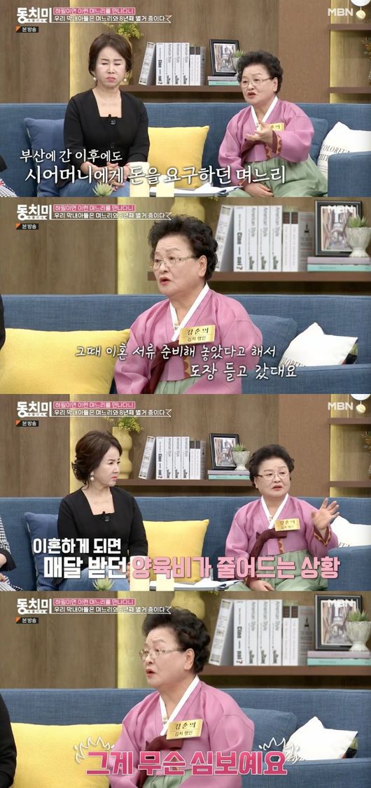 결국 화가 난 아들은 22년 넘게 몸 담았던 직장에 사표를 내고 군인 생활을 끝내고 말았다. 이에 대해 강순의는 “얼마나 속상하면 그만뒀겠나”라며 부산에서 생활하는 며느리가 계속해서 돈을 요구했다고 털어놨다.