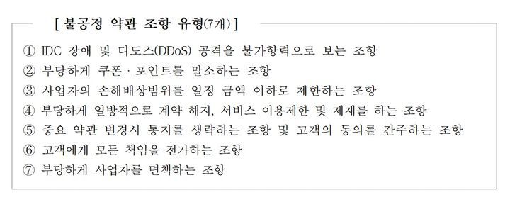 공정위가 찾아내 시정한 불공정약관은 총 7개다. 우선 IDC장애와 디도스 공격을 시정요구한 이유는 인터넷 설비 장애를 미연에 방지하는 것이 중개 플랫폼 사업자의 본질적 의무라고 봤기 때문이다.