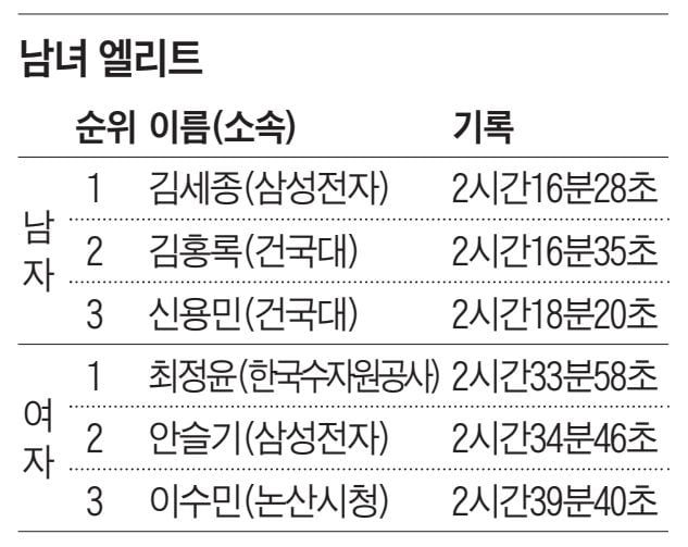 여자 엘리트 부문은 최정윤(30·한국수자원공사)이 2시간 33분 58초 기록으로 1위에 올랐다. 최정윤은 아버지 최진혁(60)씨가 1984년 이 대회(당시 서울~성남 왕복)에서 2시간 21분 20초 기록으로 우승한 바 있어 ‘부녀 우승’이란 진기록을 남기게 됐다. 마라톤 국가대표 출신 아버지 외에도 어머니 이정숙(58)씨가 올해 풀코스 3시간 14분대 기록을 쓸 정도로 육상 유전자를 타고났다. 최정윤도 충남체고를 거치며 어린 시절부터 엘리트 육상 선수 길을 걸었다. 여자 2위는 안슬기(31·삼성전자·2시간 34분 46초), 3위는 이수민(31·논산시청·2시간 39분 40초)이 차지했다.