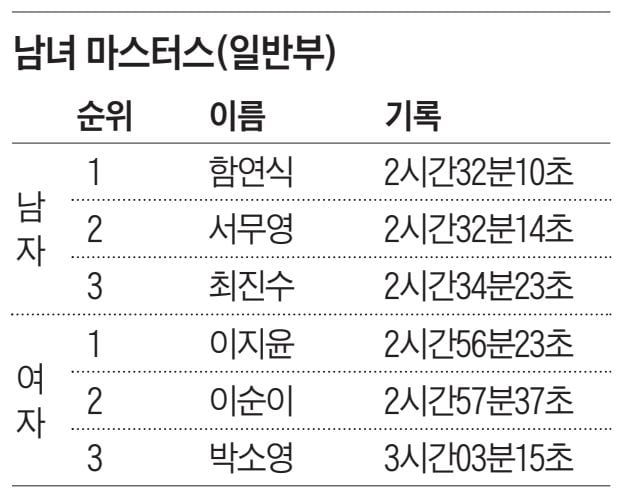 남자 마스터스(일반부)에선 함연식(44)씨가 2시간 32분 10초 기록으로 가장 먼저 결승선을 끊었다. 그는 “사실 오늘 컨디션이 좋진 않았다. 7㎞부터 왼쪽 골반 쪽에 통증이 와서 25㎞ 지점엔 중단할까 고민도 했다”며 “이후 2시간 26분대 목표 기록 대신 완주를 목적으로 뛰었는데 우승까지 해서 너무 기쁘다”고 했다.