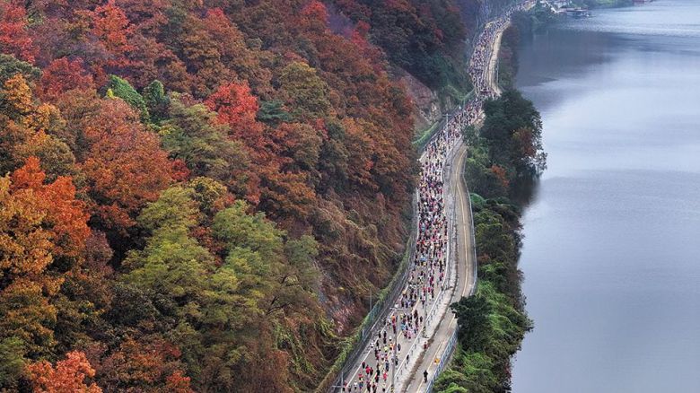 "가을엔 춘천마라톤… 단풍의 노래 들으며 1만8000명이 달렸습니다" 춘천 시민 협조에 감사드립니다 - 청명한 가을 날씨 속에 단풍으로 물든 호반(湖畔)의 도시 춘천 거리를 1만8000여 명이 달렸다. 29일 열린 2023 조선일보 춘천마라톤(조선일보사·스포츠조선·대한육상연맹 공동 주최)에서 참가자들이 의암호 주변을 지나는 모습. 기록은 천차만별이었지만 결승선을 통과하는 사람들 표정은 해냈다는 성취감으로 충만했다. /오종찬 기자