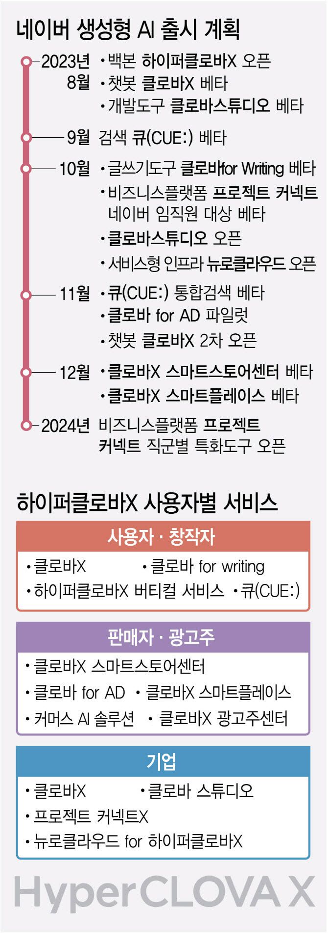 앞서 네이버는 지난 8월 ‘하이퍼클로바X’ 공개 이후 대화형 AI 서비스 ‘클로바 X(CLOVA X)’, 생성형 AI 검색 서비스 ‘큐:(Cue:)’를 연달아 선보인 바 있다. 이어 이번에 기업간거래(B2B)까지 그 확장성을 넓혔다.