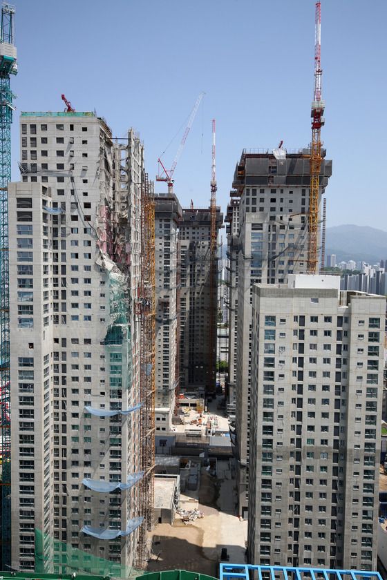 (광주=뉴스1) 황희규 기자 = HDC현대산업개발이 붕괴 사고가 발생한 광주 화정아이파크 8개 동을 전면 철거하고 재시공한다고 8일 밝혔다.   HDC는 철거 후 재시공은 총 70개월이 걸릴 것으로 예상, 추가 비용은 약 2000억원으로 추산했다.사진은 외벽이 붕괴된 화정아이파크의 모습. 2022.5.4/뉴스1
