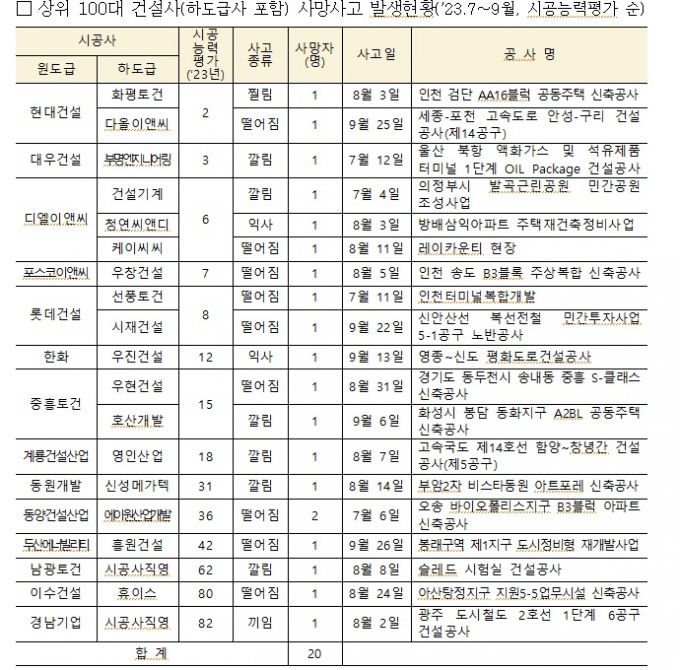 국토부 '2023년 3분기 사망사고 발생 상위 100대 건설사' 명단 발표