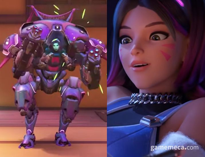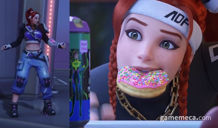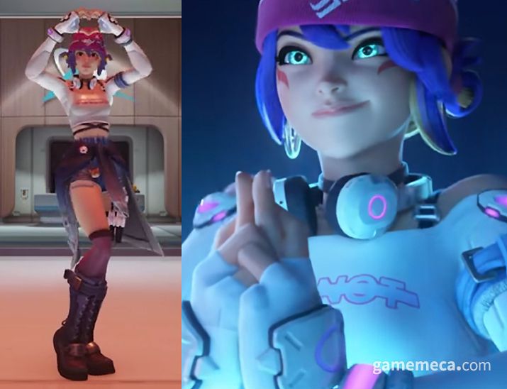 ▲ 28일 틱톡 영상을 통해 공개된 게임 내 모습(좌)와 27일 뮤직비디오를 통해 공개된 스킨 모습 (우) (사진출처: 오버워치 틱톡/하이브 레벨 유튜브 채널 뮤직비디오 갈무리)