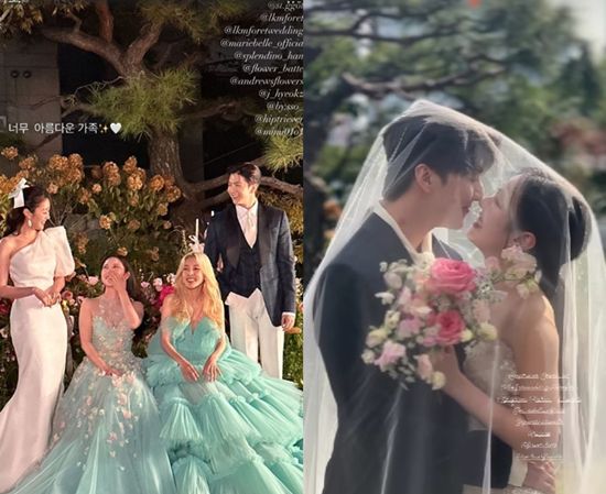 이날 공개된 사진에는 웨딩 드레스를 입은 미미가 담겼다. 양옆에는 민트색 드레스를 입은 천둥의 누나들이 담겼다. 특히 금발 스타일의 산다라박은 디즈니 공주 같은 분위기를 발산했다. 미미는 "너무 아름다운 가족"이라는 글을 덧붙이며 행복한 심경을 전했다.