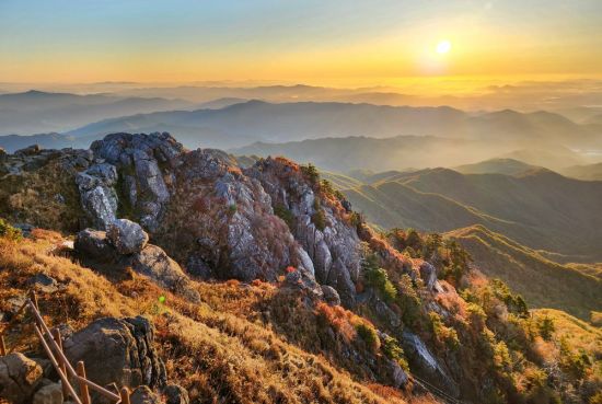 첩첩 이어지는 능선에 여명이 물들고 있다