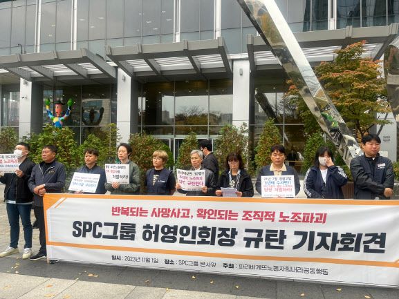 [이데일리 권효중 기자] 민주노총 화섬식품노조와 파리바게뜨 노동자 힘내라 공동행동(공동행동)은 1일 서울 서초구 양재역 SPC 본사 앞에서 기자회견을 열고 사측의 노조 파괴 움직임에 대한 신속한 수사가 필요하다고 목소리를 높였다. 특히 이들은 허영인 SPC그룹 회장에 대한 빠른 수사가 필요하다고 강조했다.