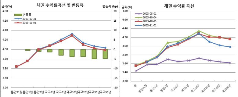 또다른 채권시장 참여자는 “전일 미국채 시장이 약했던데다 10월 수출이 플러스로 돌아선 것으로 발표되면서 오전장엔 약세흐름을 보였다. 오후들어 일본의 국채매입 소식과 이창용 한은 총재의 도비시한 발언 등으로 강세전환했다”며 “오늘밤 예정된 FOMC가 매파적으로 예상되나 이미 선반영돼 있는 만큼 영향은 크지 않을 것으로 보인다. 되려 도비시하게 나올 경우 강세폭이 커질수 있겠다. 내일 바이백 이후 10년물 이상 구간의 변화도 주목할 필요가 있다”고 밝혔다.
