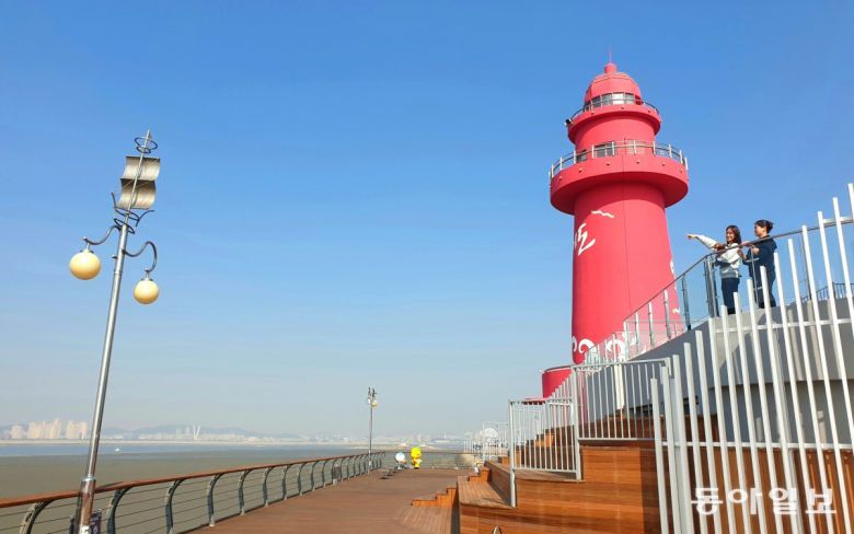 경기 시흥시 오이도항의 랜드마크인 빨간 등대가 전망대 형태로 리모델링을 마치고 1일 일반에 개방됐다. 오이도항을 찾은 시민들이 빨간 등대를 배경으로 드넓은 갯벌과 바다를 조망하고 있다.