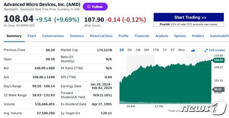 1일(현지시간) 뉴욕증시에서 AMD는 전거래일보다 9.69% 폭등한 108.04 달러를 기록했다.