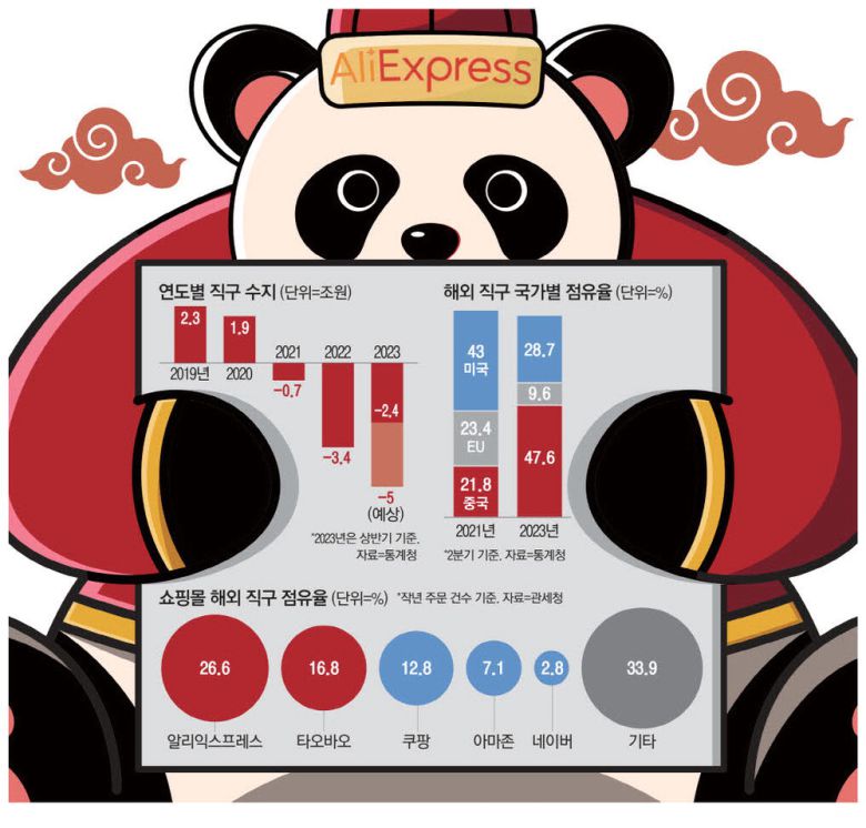 초저가 상품을 앞세운 알리익스프레스 등 중국 직구 플랫폼 공세가 거세지면서 올해 해외 온라인 '직구 수지'(해외 직판매와 직구매 총액의 차이) 적자가 5조원을 넘을 전망이다. 합리적 소비에 관심 있는 한국 소비자는 중국 광군제, 미국 블랙프라이데이 등 해외 쇼핑 일정까지 챙기며 직구를 늘리는 반면, 한국 제품 직판의 주요 소비자이던 중국 보따리상(다이궁)들은 하이난 면세특구 등으로 구입 채널을 대거 변경했기 때문이다.