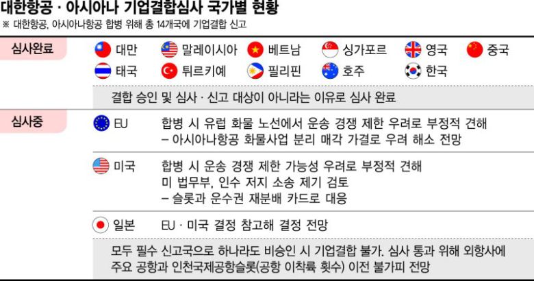 추후 EC의 승인을 받더라도 두 항공사의 최종 합병을 위해서는 미국과 일본의 승인이 필수다. 문제는 두 나라가 독점 우려를 이유로 대한항공에 슬롯 및 노선 반납을 요구할 수 있다는 점이다. 앞서 대한항공은 합병 시 영국 LCC 버진애틀랜틱에 7개 슬롯을, 중국에는 46개의 슬롯을 반납하기로 했다. 슬롯은 시간당 비행기가 이착륙할 수 있는 횟수다. 항공사가 운수권(특정 노선에 취항할 수 있는 권리)을 가지고 있더라도 슬롯이 없으면 비행기를 띄울 수 없어 항공사 수익성에 큰 영향을 미친다. 업계는 인천~뉴욕, 인천~시카고 등 '알짜 노선'이 반납목록에 포함될 것으로 내다보고 있다.