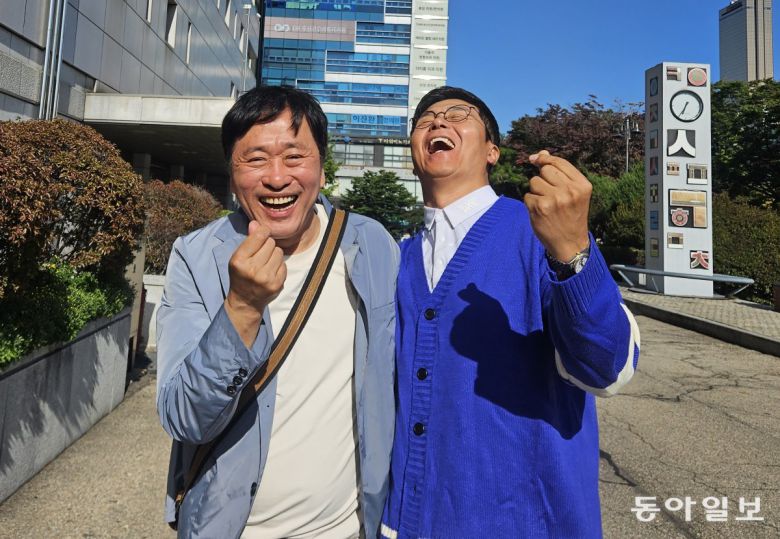 누가 봐도 유쾌, 상쾌, 통쾌한 신창석 KBS 드라마 PD(왼쪽) 와 ‘만능 연예인’ 이정용이 가을 하늘이 눈부신 10월의 어느 날 서울 여의도에서 손가락 하트를 펴보이고 있다. 둘은 서로가 자신의 인맥 1순위다. 유재영 기자 elegant@donga.com |