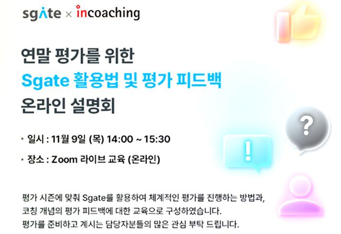 이번 웨비나는 서비스형소프트웨어(SaaS)인 에스게이트를 활용해 인사 평가 업무의 효율적인 운용 방법과 평가 과정에서 이슈로 부상한 평가피드백에 대해 코칭 전문 기업인 인코칭이 강연한다.