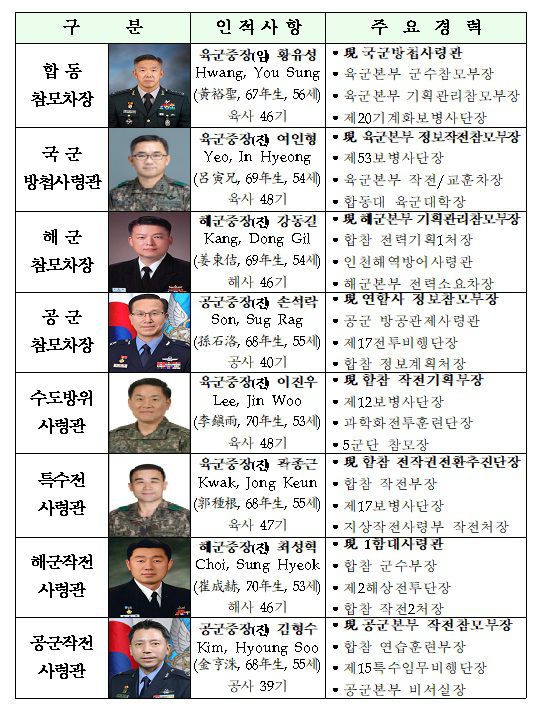 해군소장 강동길은 해군참모차장, 최성혁은 해군작전사령관으로, 공군소장 김형수는 공군작전사령관, 진영승은 합참 전략기획본부장, 손석락은 공군참모차장으로 진급·보직된다.