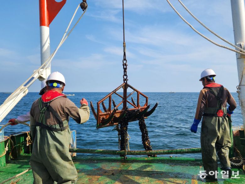 도르래에 달린 쇠갈고리로 바다 밑에 가라앉아 있던 폐로프를 건져 올리자(위 사진) 죽은 홍합 껍데기가 다닥다닥 붙어 형체를 알기 어려운 폐로프가 모습을 드러냈다. 양양=김예윤 기자 yeah@donga.com |