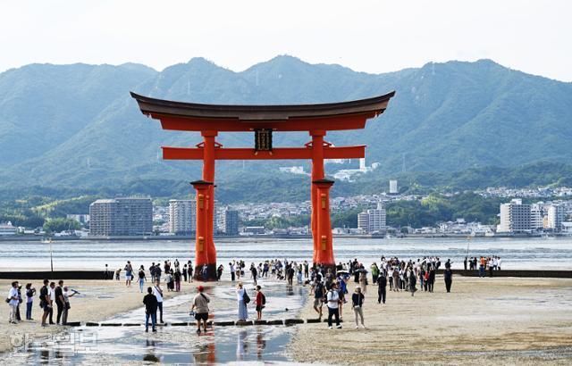바다 위 모래갯벌에 세워진 히로시마현 이쓰쿠시마 신사 도리이. 이쓰쿠시마 신사는 오래전부터 세토 내해를 항해하는 상인과 어민이 안전과 평화를 기원하던 곳이다. |