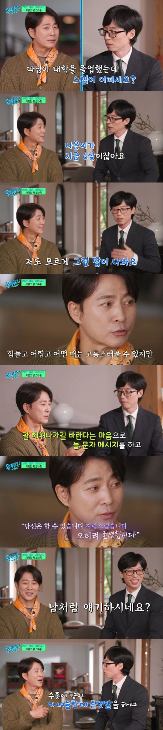 유재석은 "나은이가 지금 6살인데 나도 모르게 그런 말이 나온다. 너무 좋아 집에서 나은이를 안아주고 얘기를 많이 하지만 나도 모르게 '이 험난한 세상 앞으로 어떻게 살아갈까'라는 말이 나온다"라며 공감했다.