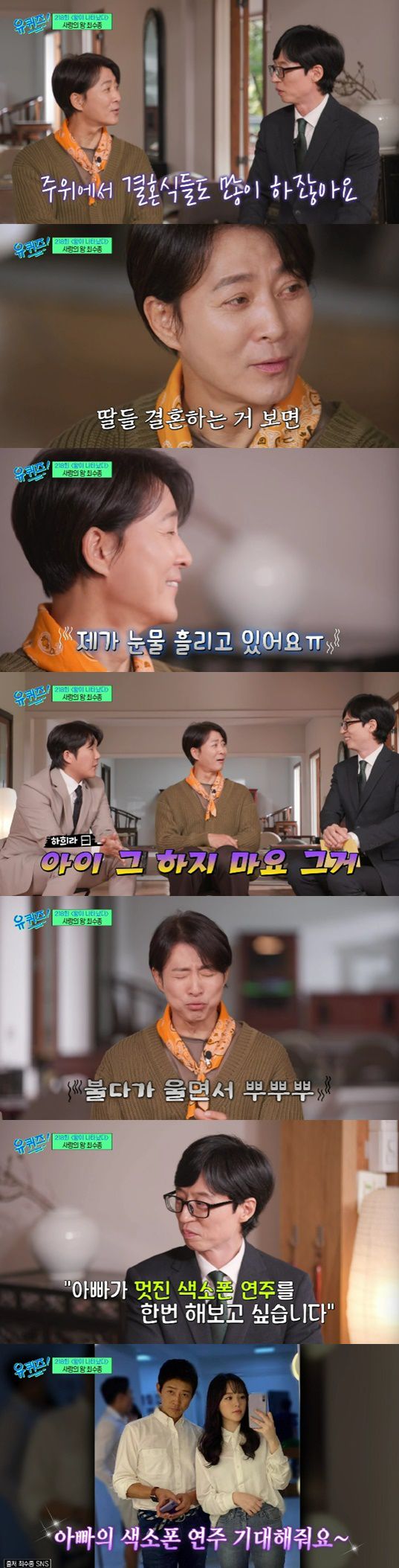 그는 주위에서 결혼식을 많이 한다. 딸들이 결혼하는 걸 보며 내가 눈물을 흘리고 있다. 최윤서 씨 결혼할 때 색소폰 연주를 해보고 싶어 배우고 있다고 하니 하희라 씨가 하지말라고 그거 불다가 울면서 하려고 하냐고 했다"라고 말해 웃음을 자아냈다.