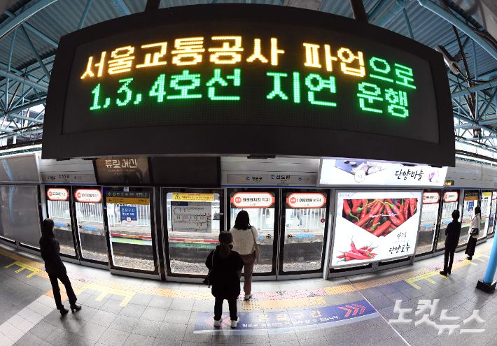 서울 지하철을 운영하는 서울교통공사의 민주노총 소속 노동조합이 이틀간 경고파업에 돌입한 9일 오전 서울 지하철 신도림역 전광판에 관련 안내문이 나오고 있다. 노조는 전날 임금·단체협약 협상이 결렬됨에 따라 이날 오전 9시부터 오는 10일 야간근무 전까지 파업에 돌입했다. 황진환 기자 |