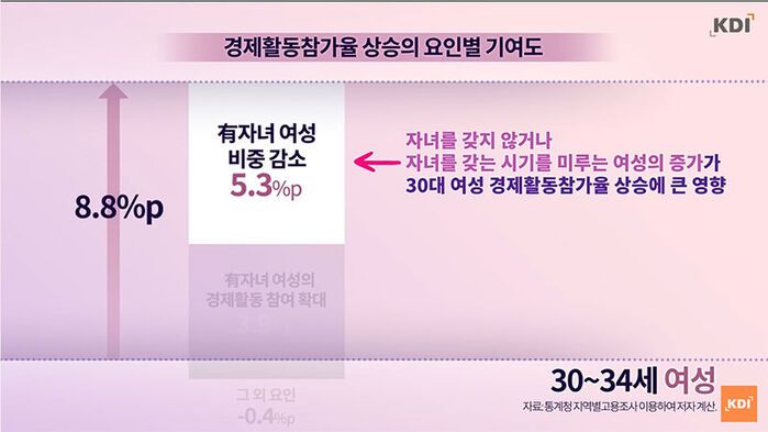 민지 씨 세대의 경제 활동 참가율이 영미 씨 세대보다 8.8%p 상승한 데에는 자녀가 있는 여성의 비중 감소(5.3%p)가 크게 기여한 것으로 나타났는데, 이는 자녀를 갖지 않거나 자녀를 갖는 시기를 미루는 여성이 증가한 것이 30대 여성의 경제 활동 참가율을 끌어올린 1차 요인이었다고, 한국개발연구원(KDI)는 분석했습니다.