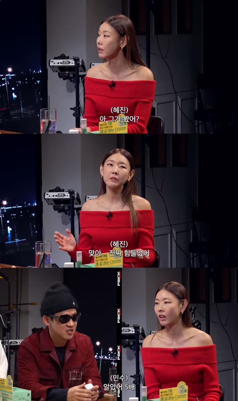 이날 한혜진은 "반갑다. 여기 나와서 너무 행복하고 파리 패션위크, 밀라노 컬렉션(의상 발표회), 뉴욕 컬렉션 이후 최고의 쇼. 제 커리어의 새로운 정점이 될 피식쇼에 초대해 주셔서 감사하다"며 인사했다.