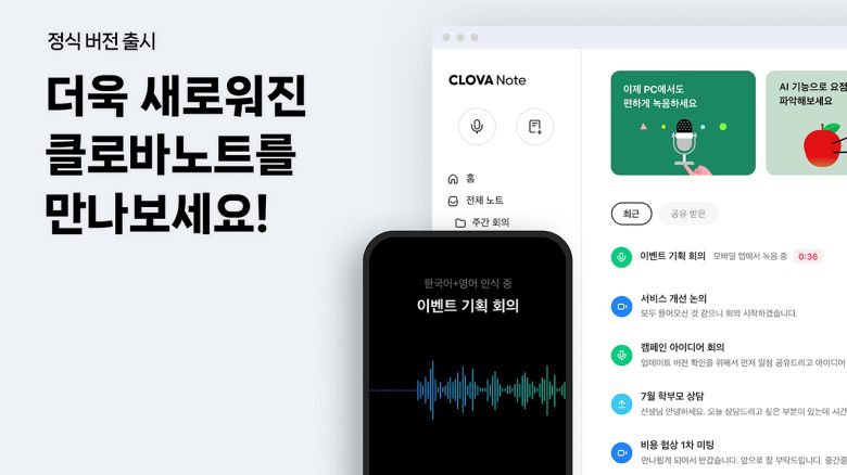 또, 정식 버전에서는 클로바노트로 직접 회의를 녹음하고, 녹음이 진행되는 동안 중요한 내용을 메모할 수 있는 기능을 PC와 모바일 애플리케이션(앱)에서 모두 지원합니다.