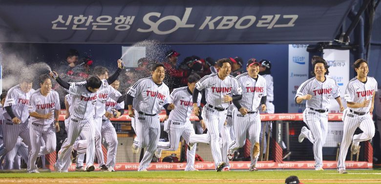 지난 13일 서울 잠실야구장에서 열린 2023 KBO 한국시리즈 5차전 kt wiz와 LG 트윈스의 경기에서 6-2로 승리해 우승을 차지한 LG 선수들이 기뻐하고 있다. /연합뉴스 |