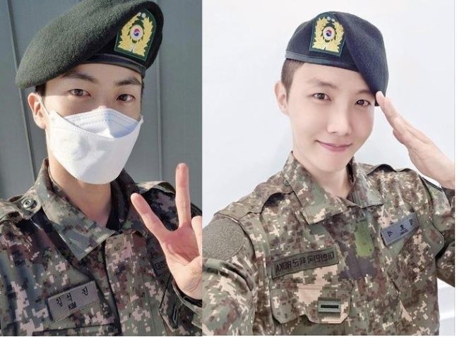 군 복무 중인 그룹 방탄소년단(BTS) 진(좌)과 제이홉(우). 팬 커뮤니티 위버스 캡처 |