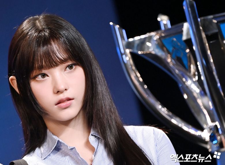 (엑스포츠뉴스 중구, 김한준 기자) 15일 오후 서울 중구 반얀트리 호텔에서 열린 '2023 리그 오브 레전드 월드 챔피언십(롤드컵)' 파이널 미디어데이, 결승전 오프닝 무대를 장식하는 걸그룹 뉴진스 해린이 포즈를 취하고 있다.