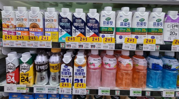 편의점 매대 가득히 진열된 단백질 음료. [안병준 기자]