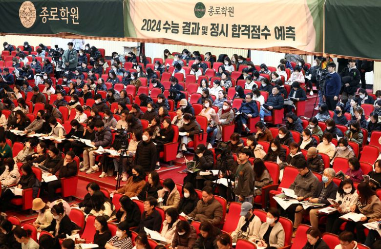 17일 오후 서울 광진구 세종대학교 대양홀에서 열린 종로학원 2024 수능 결과와 정시 합격점수 예측 설명회에서 학생과 학부모들이 강사의 설명을 듣고 있다. 연합뉴스 |