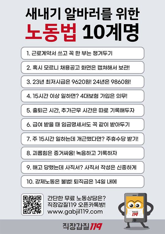 일자리 경험이 없는 학생들을 대상으로 근로계약서나 임금명세서를 주지 않거나 최저임금을 지키지 않는 사업주들을 주의해야 한다. 이에 시민단체 직장갑질119는 새내기 알바생이 꼭 알아야할 근무시기별 노동법을 공개했다.