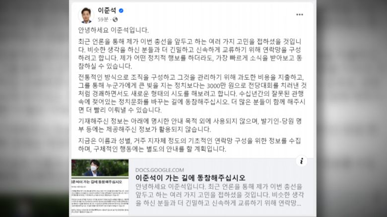 이 전 대표는 오늘(18일) SNS에 "이준석이 가는 길에 동참해달라"는 글을 올리고 이름과 성별, 거주지역 등을 수집하는 온라인 접수에 들어갔습니다.