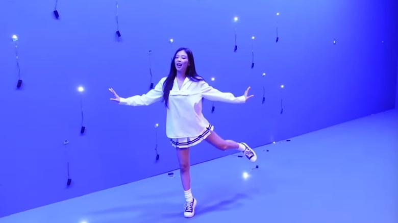 제니는 이후 파란색 포인트가 있는 세일러 상의에 짧은 미니스커트를 매치한 룩을 선보이며 밝게 웃었다.